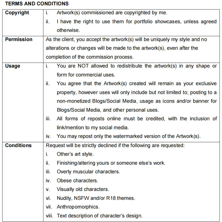 No. These are my Personal-use rates! If you are interested in distributing the artwork for marketing purposes, do email me and we can arrange for a Commercial-use commission, with commercial rates and terms!"How long will you be able to accept commission slots?"